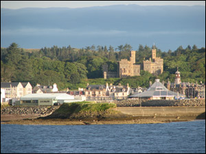 View of Lewis/Lews Castle and Stornoway harbor. Stornoway Castle (which no longer exists) would have been located near the Ferry terminal (the building on the right with the glass top) (Chapter 25).
