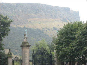 Arthur’s Seat: View from behind Holyrood palace gates. “At one time it was called Archer’s Seat. And you can see why—it looks like a ledge with an unobstructed view for as far as the eye can see” (Chapter 10).